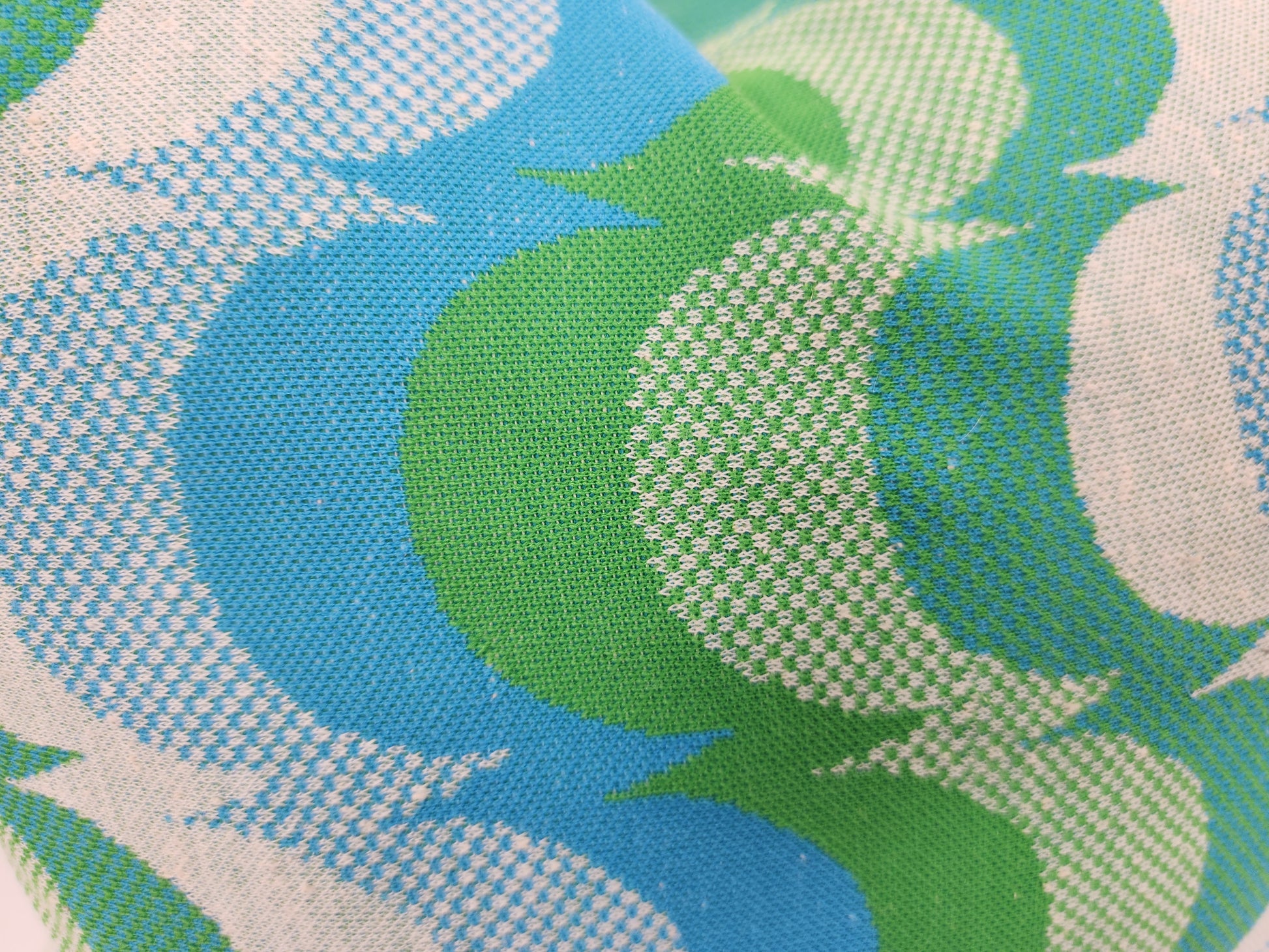 This super funky 1970s double knit fabric features this repeating wave pattern in shades of blue and green with a light beige for contrast. Double knit fabric is soft, stretchy, and washable and an excellent choice when comfort is most important. Plush feather insert is removable via the invisible zipper in the bottom seam of the cover. Only 3 available. All items made by Houston + Scott are produced using a small fleet of vintage sewing machines- This pillow on our 1955 Sewmor 620. Read more about our collection of vintage sewing machines here.