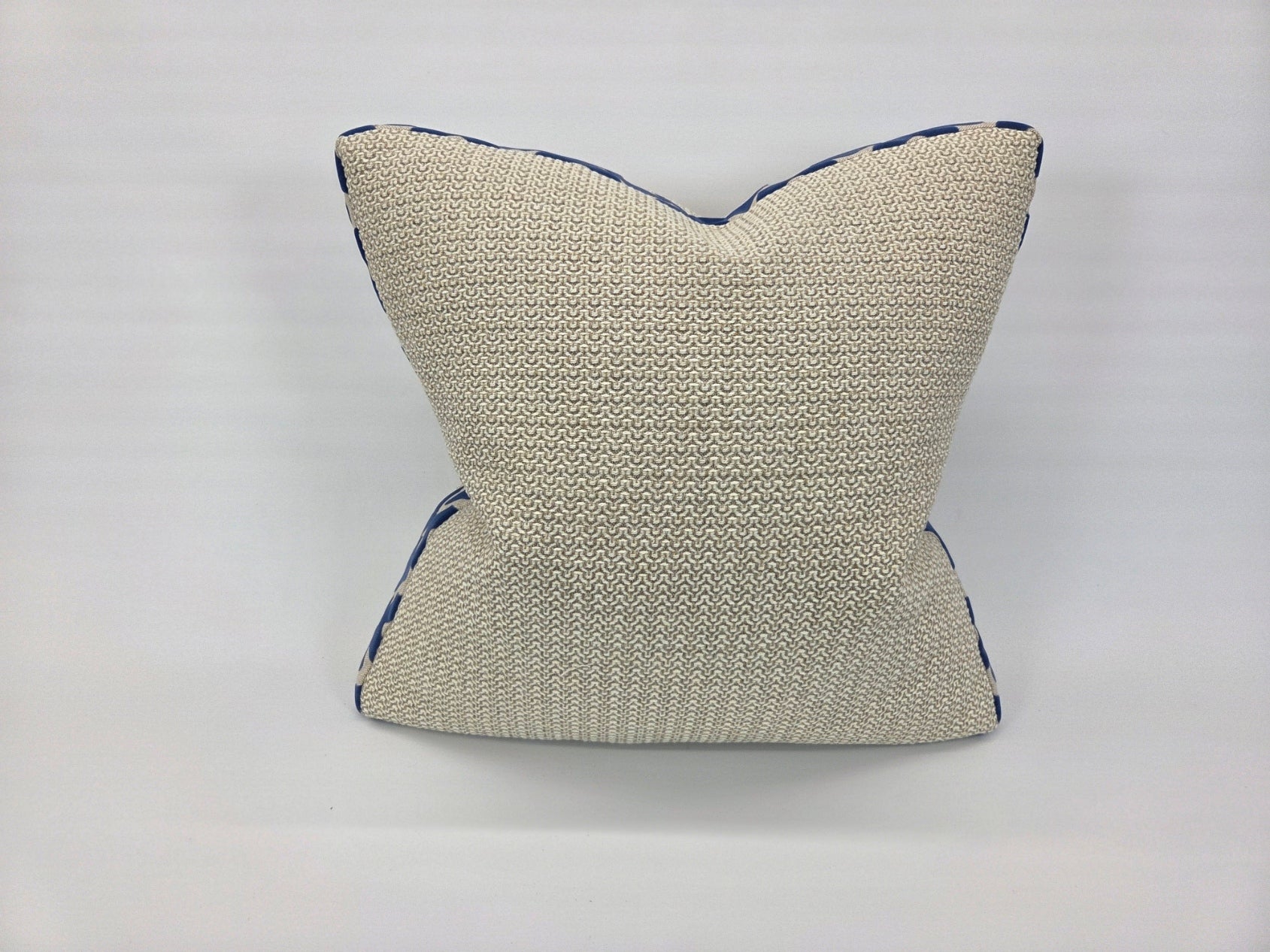 Greige Woven Pillow with Royal Blue Velvet Boxed Edge – 20" Square