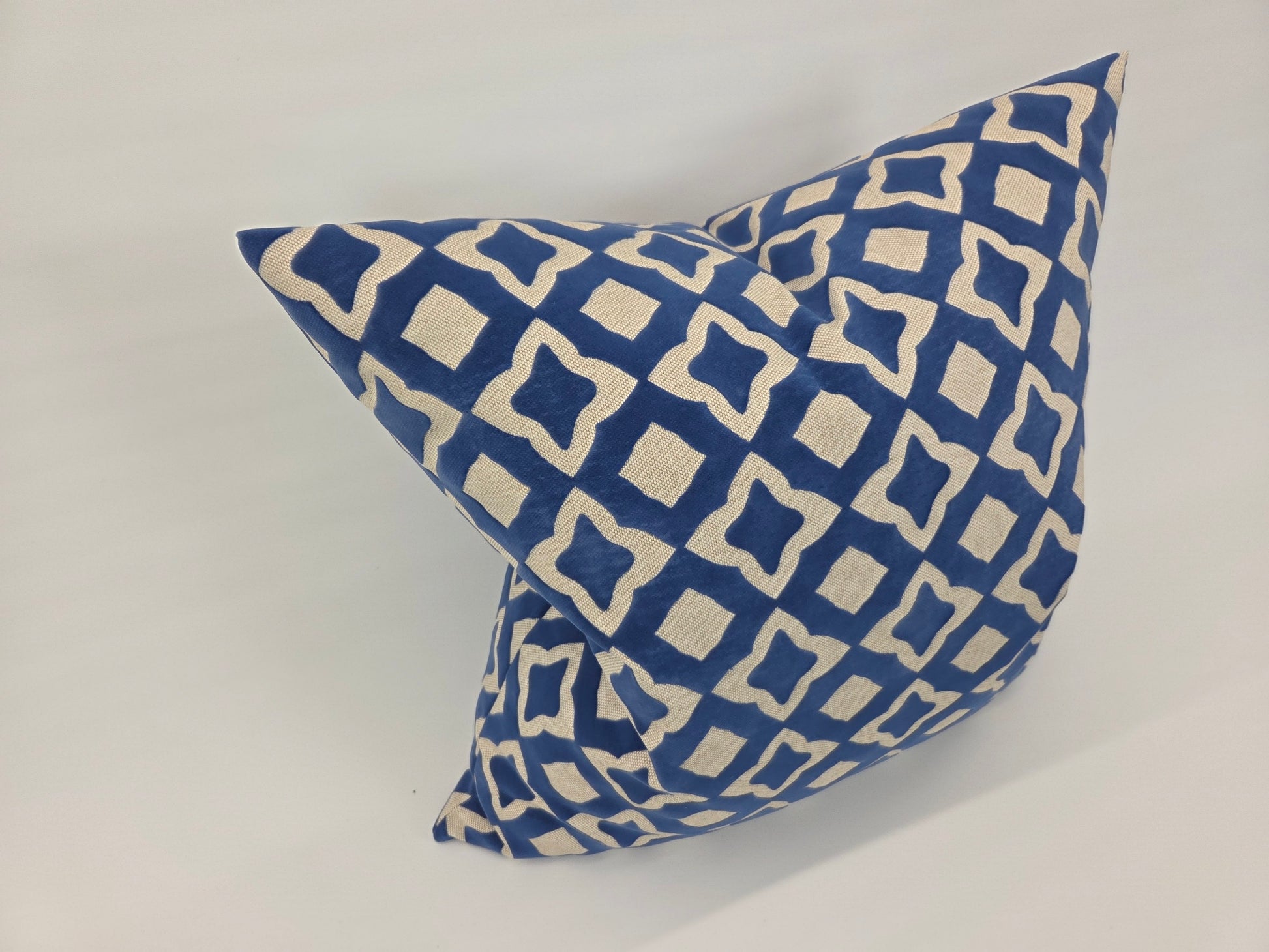 Elevate your space with this striking 22-inch accent pillow, crafted from royal blue cut velvet layered over a neutral woven ground. The geometric motif—bold yet refined—adds depth and texture, while the rich velvet catches the light for a subtle shimmer. Finished with an invisible zipper and a plush feather insert, this piece offers both luxury and comfort. Perfect for layering or standing alone as a statement, it’s a modern heirloom designed to anchor any room with quiet confidence.